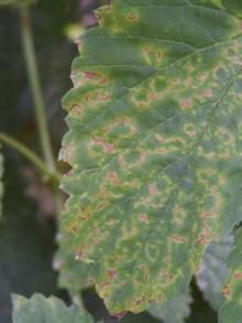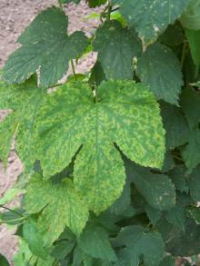 HpMV-sensitive hops show a chlorotic, pale vein-banding on the leaf, which is mottled and curls down strongly. Diseased hills may survive several years but are stunted with shortened internodes and can be killed by the infection.