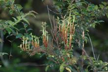Symptoms Evergreen huckleberry (Vaccinium ovatum) develops a witches' broom of thickened stems with few or no leaves. Telia form in a reddish brown layer around stems each year. Branches are swollen, spongy, and distinctly yellowish to reddish brown in contrast to the greenish color of normal twigs.