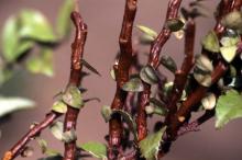 Cause Pucciniastrum goeppertianum, a rust fungus that alternates between Vaccinium spp. (huckleberry, blueberry, and cranberry) and true firs. Infection of huckleberry leads to extensive growth in the phloem each year. The telia encircle the swollen stems and produce teliospores that germinate in the spring. Teliospores produce basidiospores, which are dispersed during rain storms. These spores will infect grand, silver, balsam, and subalpine firs. Aecia produced on the fir needles shed aeciospores that infect huckleberry. A uredinial state has not been found. Cool, moist springs favor disease development. Although easily found in natural settings, it is not considered an economic or ecological problem.