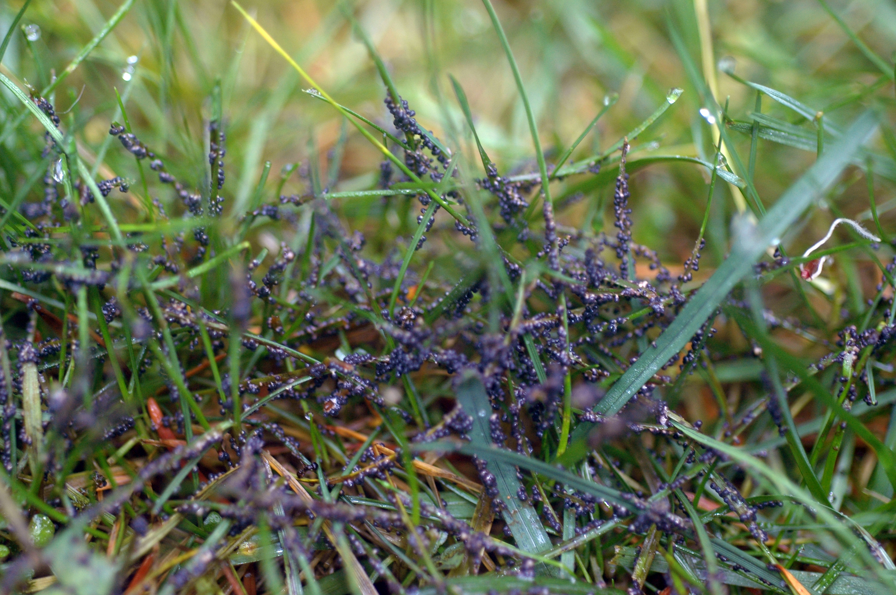 Symptoms Globular or spherical structures form on grass blades. They may be white or gray and often turn purplish brown. When the structures break, masses of fine, dark spores are released. Slime molds often appear suddenly.