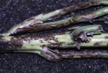 Symptoms This fungus can attack leaves, stems and pods. Flecking may be observed on cotyledons while leaf infections start as yellow patches that develop into irregular brown lesions with cracked centers, sometimes turning black. Leaf lesions can coalesce, causing death of leaves. When leaves are infected young, distortion can develop. Stem lesions are elongated brownish streaks with grayish-black margins and can be mistaken for black leg, except lesions are usually superficial. Flower infections may cause abortion. Pods infected early appear distorted while pods infected later result in relatively healthy-looking pods but will have white spore masses. Seedlings can be killed, or plants may be stunted.