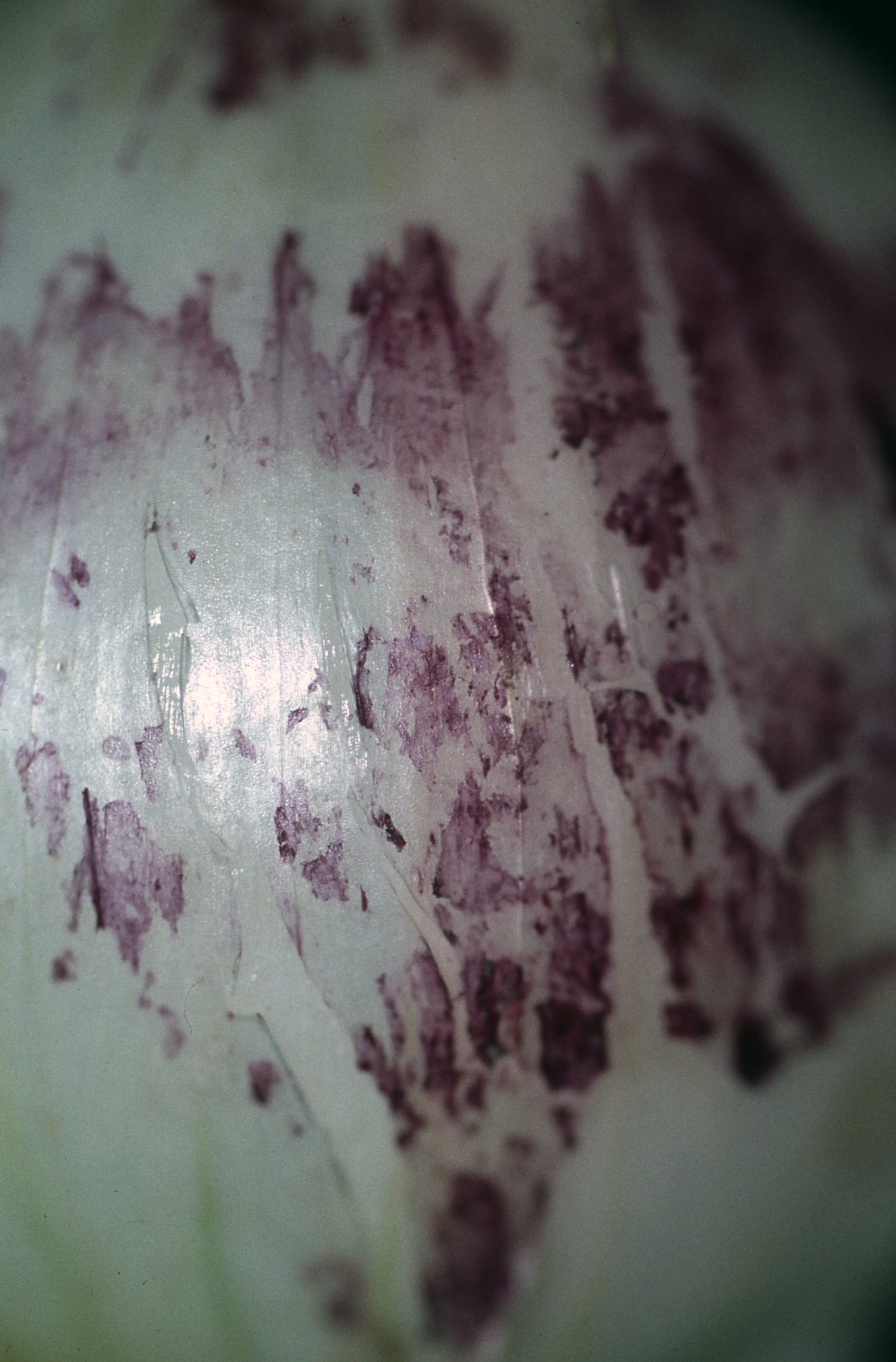 Symptoms The disease may appear either in young seedlings or later in the onion's growth. Infected roots turn yellow, then pinkish, then bright pink to red and finally to dark purple as they dry and disintegrate. New roots produced thereafter become diseased and also die. Seedlings may die. Otherwise, bulbs lack normal development, are reduced in size and vigor, and have stunted tops.