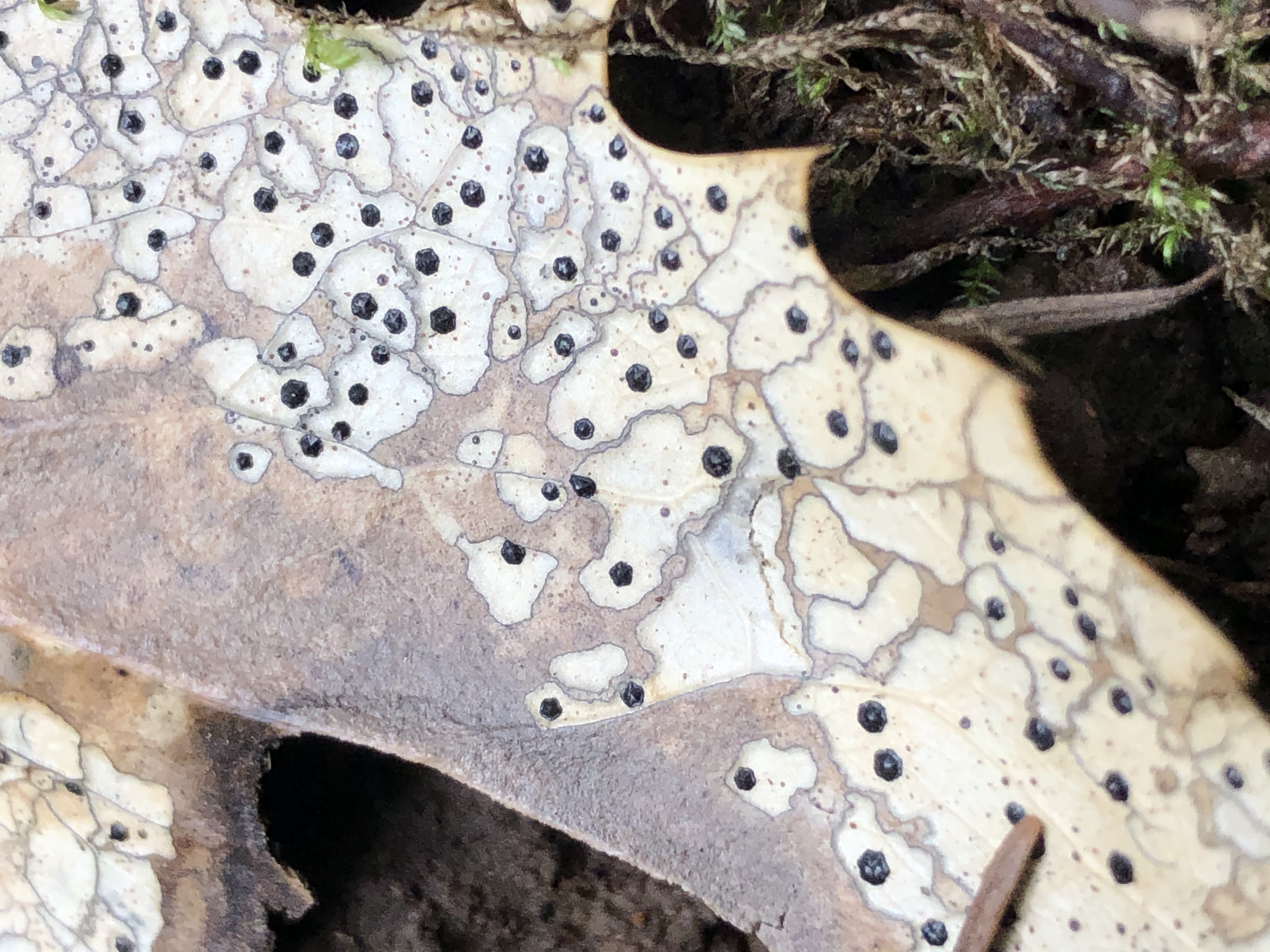 Coccomyces dentatus - dead leaf tissue with star-shaped fruiting bodies embedded in light gray areas bordered by black lines.