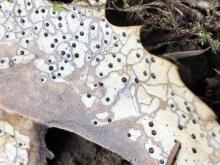 Coccomyces dentatus saprophytically colonizes dead leaf tissue forming a mosaic pattern of polygons bounded by black lines referred to as zone lines. Apothecia are star-shaped usually with 6 sides. C. dentatus zone lines are the result of antagonistic interactions between individuals of different genotype.