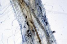Symptoms Lower leaves of infected plants turn yellow. Plants are stunted, and severely infected plants die. Infections usually start at root tips and through root hairs. Root discoloration initially is brown and becomes a dark, flat black as abundant chlamydospores form on and in the root. This blackening may extend from the roots into the crown and lower stem. Rots tend to be firm instead of soft and mushy as with Pythium. The roots of infected plugs often fail to grow beyond the original plug after transplanting. Symptoms are often not expressed until plants are subjected to unfavorable environmental conditions. All ages of plants can be affected. Within a planting there might be an uneven stand or random pattern of healthy appearing and stunted plants.