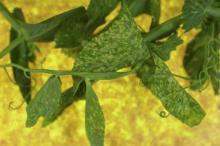 Cause The pea enation mosaic virus. At least 8 species of aphid can transmit the virus but the principal vector is the pea aphid, Acyrthosiphon pisum. After the aphid acquires the virus, it is 8 or more hours before it can transmit it to a pea plant, but the aphid retains the ability to transmit the virus for at least 24 hours, during which time it can fly or be blown long distances.