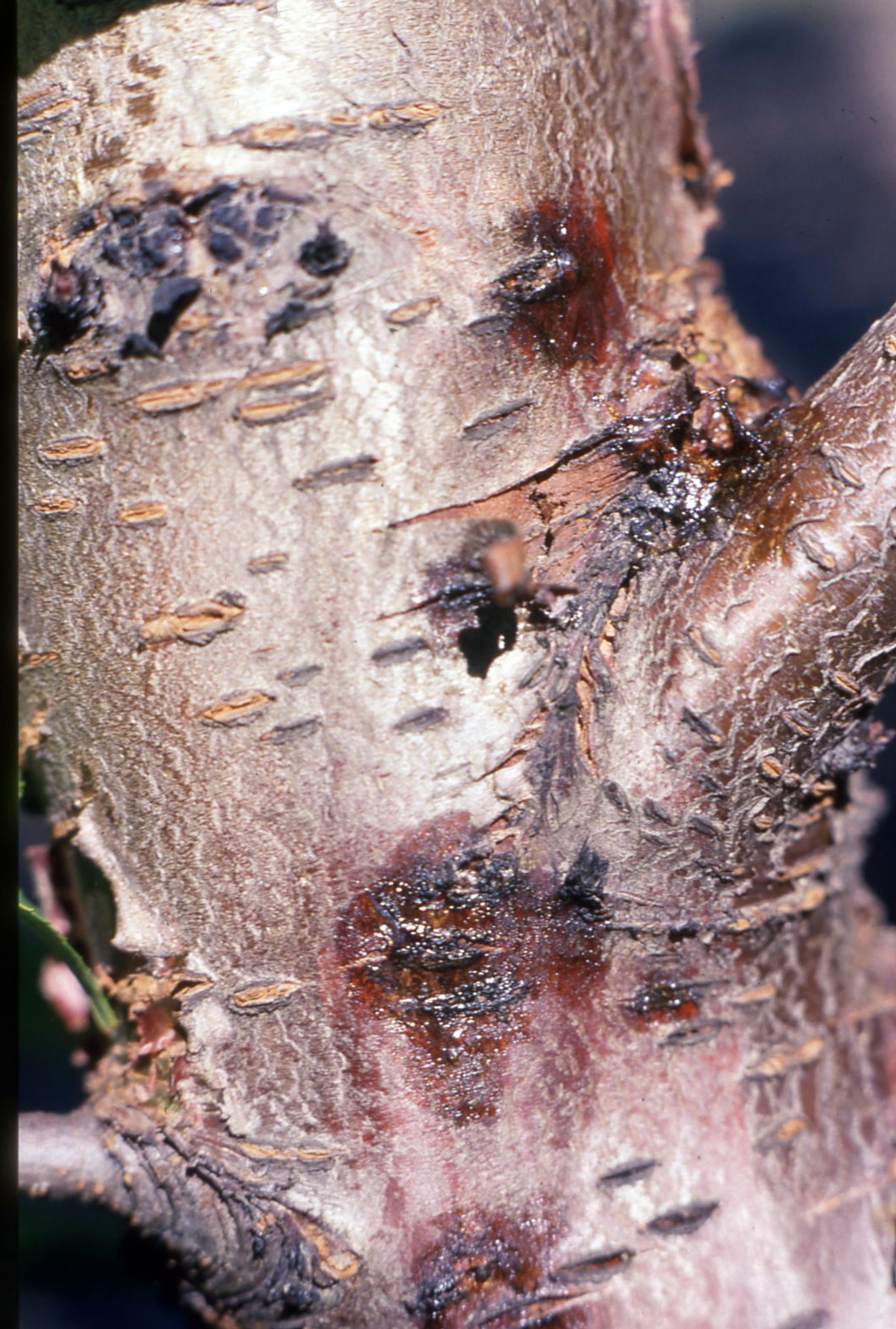 Symptoms The most conspicuous symptoms are cankers, gum exudation, and dieback of girdled branches. Dead buds and leaf spots also can occur. In most cases, heavy gumming is associated with bacterial canker formation on branches and twigs. Gumming occurs at the cankers' margins, however, other problems can also lead to gumming.