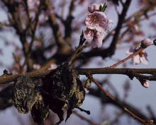 Cause The fungi Monilinia fructicola and M. laxa can incite both a blossom blight, a twig and branch dieback, and a fruit rot of several Prunus spp. including many ornamental and fruit trees. Fungi survive year to year on infected twigs, branches, old flower parts, or mummified fruit. Conidia are produced on infected plant debris in the tree when the temperature is above 40°F. A small, mushroom-like structure (apothecium) can be produced on fruit that drops to the ground. Wind and rain blow spores (conidia and ascospores) to healthy blossoms in spring to begin the infection process during wet weather. Infection will occur for M. laxa above 55°F. Infection may occur at any temperature above freezing with 24 hours wetness. Flowers can be blighted any time floral tissue is exposed but are most susceptible at full bloom. More spores can be produced on this tissue, initiating several more disease cycles during the spring.