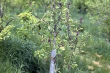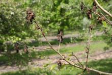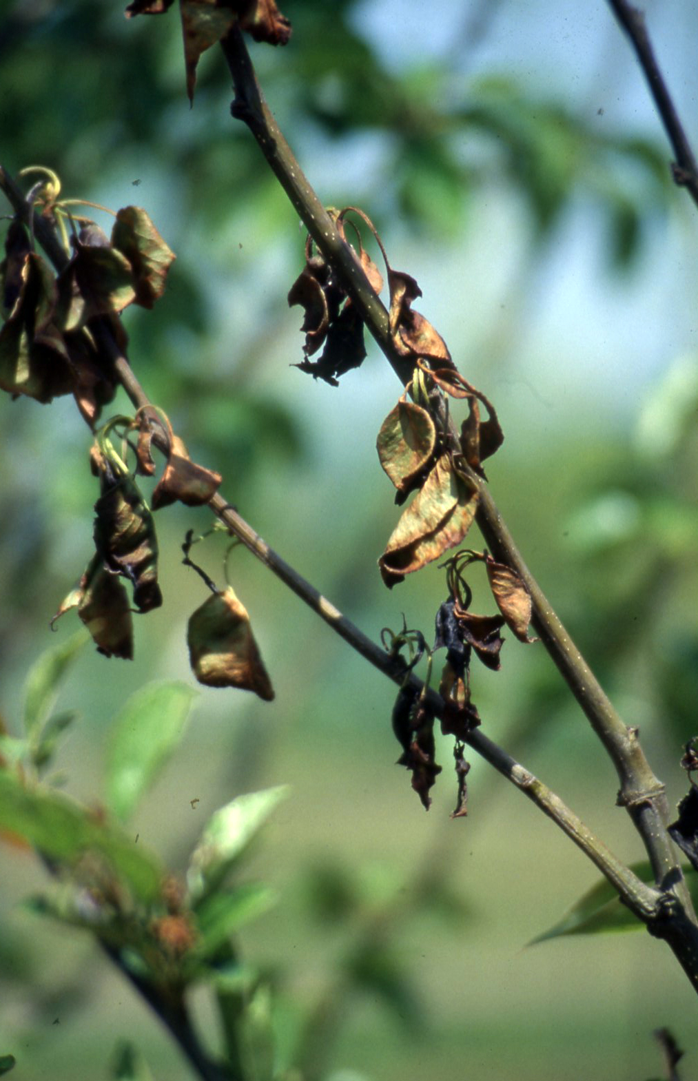 The blossom blast may closely resemble that of fire blight but is different in that necrotic tissue seldom extends more than 1 to 2 inches into the spur and never involves a bacterial exudate. The blossom blast also may resemble that caused by Botrytis. May also cause canker on young trees.