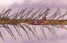 Dasyscyphus canker - The perennial cankers are swollen and flat faced and the bark over the canker is roughened and cracked. Excessive resin flow is often associated with the cankers. They are usually found on the smaller branches which they eventually girdle. On larger branches the cankers persist, but do not girdle the branch. The cup-shaped fruiting bodies (apothecia) present on the face of the cankers measure up to 0.25 inch in diameter and have a short stalk. The inner surface of the cup is bright orange, while the outside is brown and hairy.