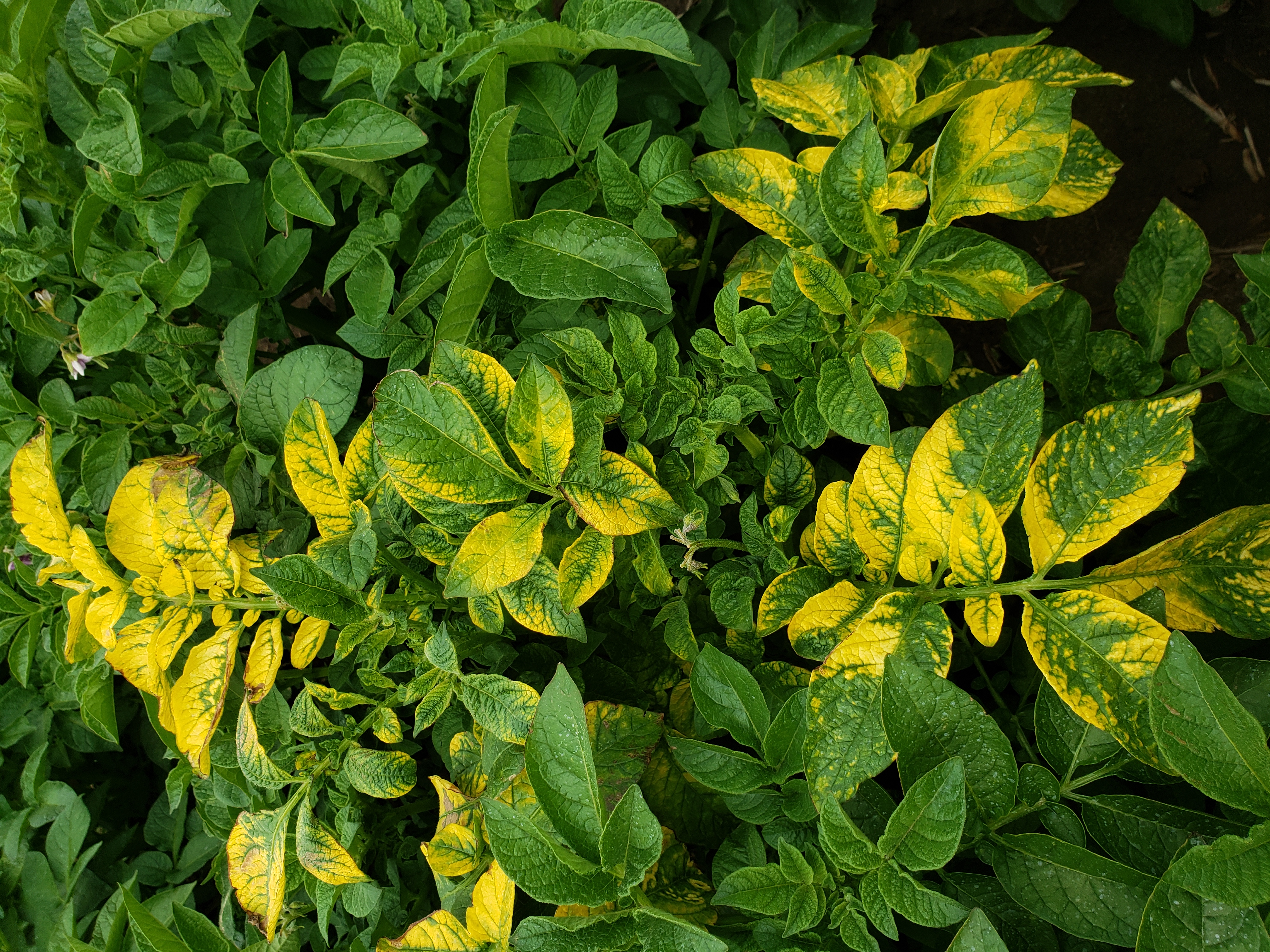 Symptoms Large, irregular, yellow to cream-color spots appear on leaves. Tubers may show internal brown necrotic areas.