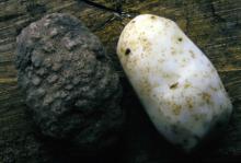 Symptoms Root-knot nematode infection rarely causes aboveground symptoms in potatoes. External symptoms of M. chitwoodi are distinct pimple-like bumps and lumps on tubers. M. hapla usually produces a more general swelling on the tuber or none at all. Both species produce brown spots within the vascular ring, within 0.25 inch of the tuber surface. Brown spots are about 0.04 inch (1 mm) in diameter and are evident only when the female nematode begins egg production. The female's white body and egg sac containing eggs (egg mass) produced outside the body often can be seen with a hand lens in the center of the brown spot. Unless several nematodes are in the same area, the spots' borders are distinct. The spots should not be confused with symptoms of heat necrosis, which produces spots of similar size but more diffused. Tubers infected with late season infection of M. chitwoodi may not show visible external or internal symptoms at harvest but may develop them in storage.