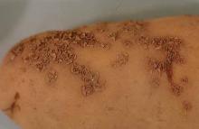 Symptoms Scabs can be observed as purple to brown raised lesions on the tuber surface. It usually is evident that the potato's epidermis has broken away to expose the powdery masses of sporosori. Lesions are typically very small in diameter during early infection (< 0.1 inch) and can expand to 0.3 inches in diameter. Symptoms can present similarly to those caused by common scab; however, they can be differentiated by scraping lesions and observing sporosori microscopically.