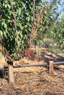 Focus on cultural control tactics first and supplement with chemical control. Traditional recommendations encourage the first spray to occur in October before fall rains followed by another application in early January. Growers should consider adjusting the timing of sprays to coincide with leaf fall. Thorough coverage is needed. Protecting heading cuts made after planting a new orchard is also important. Protect both orchard and nursery trees (sweet cherry, prune, and plum). Some growers use low rates of copper-based products during bud break to reduce symptoms of dead bud.