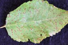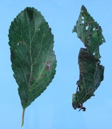 Symptoms Both fungi produce small, purplish, circular spots that turn brown as they enlarge. Spots caused by shothole are generally larger. Often the spots' centers drop out, giving the leaf a shothole appearance.