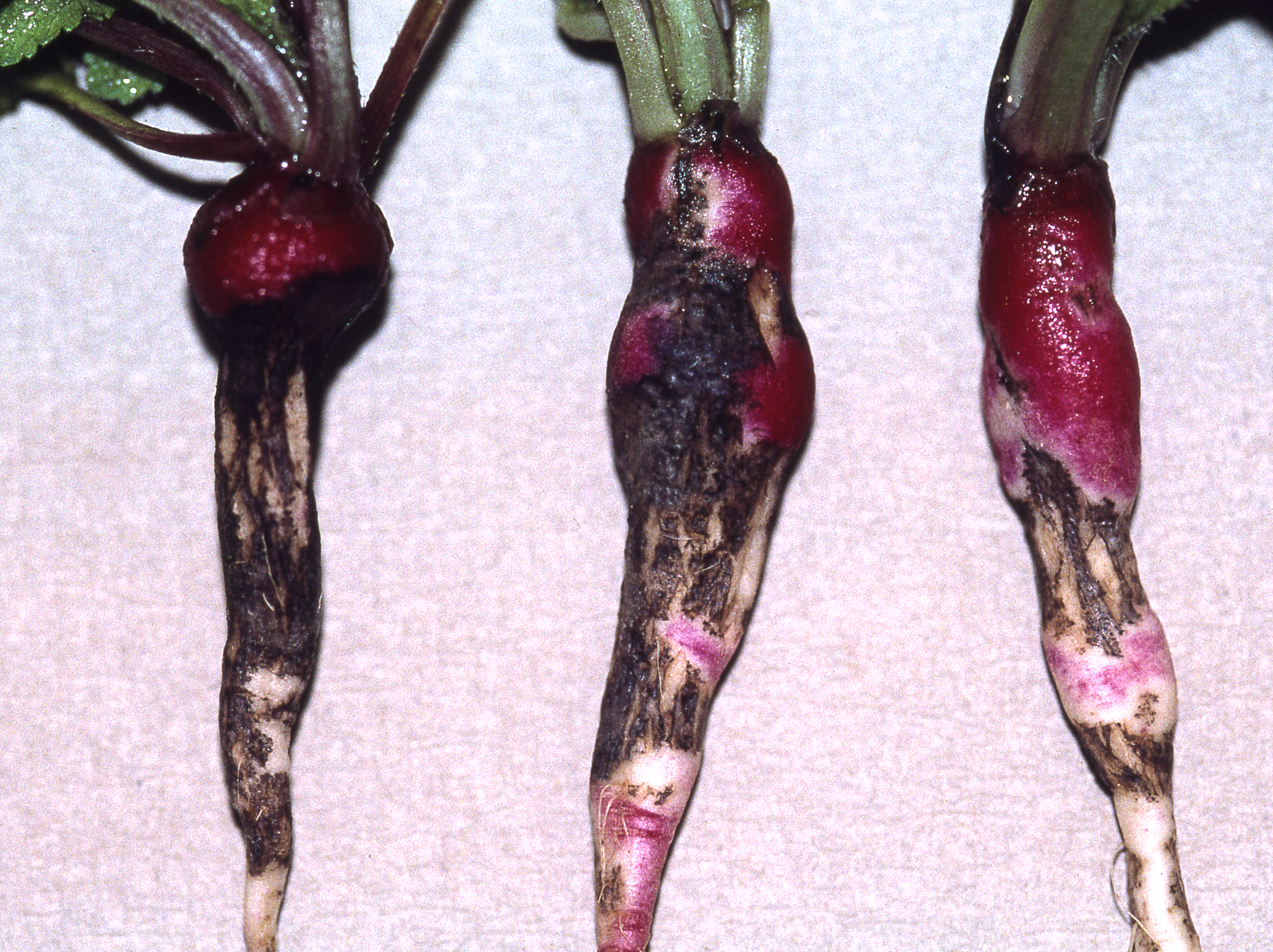 Symptoms Symptoms appear around side roots, or at growth cracks, or at wounds on the upper root. These areas are discolored a brown to bluish black. As the disease progresses, root growth there ceases, resulting in a blackened, constricted area that sometimes girdles the entire root. This black discoloration extends inward in radial streaks.