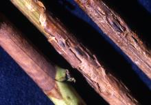 A brown, shield-shape lesion may initially be seen around a cane node, which indicates infection via a colonized leaf petiole. This shield shape will be lost as the lesion expands. Cane infections between nodes appear as tan-to brown-lesions and expand in both directions often encompassing more than one node. Cane lesions exhibit typical concentric "watermark" patterns from late summer through late winter. Sclerotia may be visible on canes as shiny, black, blister-like structures. Sclerotia appear on spent floricanes during early fall and later on primocanes in late fall and throughout the winter. Young damaged primocanes may be killed when lesions girdle the cane. Lesions on older primocanes usually do not kill the canes.