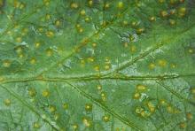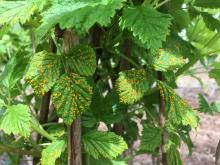 Symptoms Leaf infections in spring and early summer create a yellowish spotting on the upper leaf surface. At first the spots are very small, yellow to orange and slightly raised (spermagonia) but then new, yellow to orangish spore bearing structures (aecia) are produced in a ring around these spots. By summer, another yellow spore stage (uredinia) appears on the lower leaf surface. Some of these structures could be described as "orangish," without a good comparison. Fruit often dies on the canes before maturing if leaves on fruiting laterals are attacked early in the summer. By harvest, black overwintering spores (teliospores) appear in the yellow uredinia on the lower leaf surface. Defoliation of severely infected leaves is common. All succulent plant parts are subject to infection, but cane lesions rarely are observed. Infected canes often are brittle and may break off when old fruiting canes are pruned out.