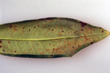 Symptoms First, light-yellow or yellow-green spots on the upper leaf surface and brown to purple spots on the lower surface. Blisters form in this area of the lower leaf surface, and they rupture to expose typical yellow to orange-red pustules containing the urediniospores. This windborne spore reinfects only rhododendron. Several generations may develop during the growing season. Severe infections may cause defoliation. The disease usually appears in late summer and fall on the previous season's foliage. Secondary fungal invaders may opportunistically colonize these areas causing various necrotic leaf spots.