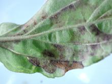Symptoms Yellow spots with either diffuse to angular borders and white to grayish-purple, fuzzy fungal growth under leaves.