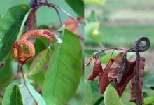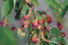 Symptoms Undersides of leaves develop circular yellow to orange lesions (aecia). When mature, aecia develop numerous spore horns, which protrude from the leaf surface in a rosette pattern. Aeciospores may be yellow or brown. Spore horns may form only on fruit, petiole, small twigs and/or leaves, depending on the rust species. Defoliation, swellings of petioles and twigs, mummification, or destruction of the fruit also may occur. Rust infected shoots tend to not survive the next winter.