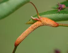 On the juniper or cedar host, witches' brooms or swellings and galls of branches can be observed. Yellow to orange telial horns are produced in the spring.