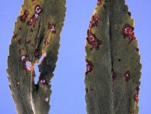 Symptoms Dark brown circular or semicircular zonate spots with a central sunken pale or whitish area surrounded by somewhat elevated concentric markings. The central pale area may fall out leaving leaves with a shothole appearance. Abundant minute black fruiting bodies (pycnidia) may be seen around the rim of the shothole. Lower leaves tend to show symptoms first. If the disease is severe, leaves may shrivel and die; however, they generally stay on the stem. Alternaria is very similar but will not produce fruiting bodies.
