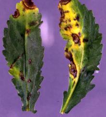 Cause Septoria leucanthemi, a fungus that overwinters on plant refuse and on living plants. Spores can be spread by splashing water from rain or irrigation. Once on the leaf, spores germinate and enter through stomata. More than 12 hours of wetting is required for spore germination and leaf infection. Optimum temperature for disease expression is 74°F to 79°F. This species has been reported in both Oregon and Washington.