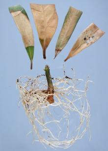 Symptoms Roots become brown and rotted. Root crowns become soft, discolored and water-soaked. Above ground, the green leaves wilt due to non-function of the root system. Stem dieback may also occur.