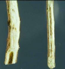 Symptoms May occur within a few weeks of planting into infested soil. Leaves become wilted or light brown and appear scorched, sometimes only on one side of the leaf or near the leaf margins. Symptomatic leaves may fall prematurely or hang on dead branches. Branches may wilt at the tips. Sapwood appears discolored with reddish brown streaks, compared to normal sapwood, which is yellowish white. Symptoms may occur on several random branches on a plant or on only one side of a branch. Infected plants may die within a few months. Overall growth may be stunted.