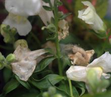 Cause Botrytis cinerea (sexual: Botryotinia fuckeliana) and other Botrytis spp., fungi that colonize dead, dying, and wounded plant parts. From these infections they can attack healthy tissues. A moist, humid environment is ideal for pathogen sporulation and spread. Spore dispersal is stimulated by changes in relative humidity. Conidia may come from many sources in and outside the greenhouse. Concentrations peak in the greenhouse during irrigating, spraying pesticides, harvest, and shipping. It is found everywhere plants are grown and has a wide host range wide host range including African violet, ageratum, ajuga, aphelandra, aster, begonia, caladium, calceolaria, carnation, chrysanthemum, coleus, cyclamen, fuchsia, geranium, gloxinia, hosta, Iberis, impatiens, lily, lobelia, marigold, orchid, pansy, Pericallis hybrids, petunia, poinsettia, primrose, rose, snapdragon, verbena, viburnum, zinnia, and zygopetalum. Geranium is considered highly susceptible to a point that it could be a significant harbor of the pathogen for other greenhouse crops. Flower petals are most susceptible at any stage of development. Blossom blight, leaf spots, and bud and stem rots are common. Leaf blights can start when infected floral tissue falls on healthy leaves.