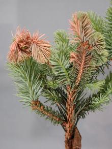 Symptoms New shoots die back in summer. At first, needles may turn brown starting at the base or fall off in the middle of the shoot near the infection point. If the twig dies during shoot elongation, a characteristic hook shape develops. Diseased twigs slowly die back to the branch where the bud began. Numerous small, black, fruiting bodies (pycnidia) develop on the twig about a year after the infection began. Can be confused with frost or herbicide damage.
