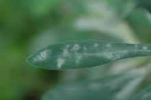 Symptoms White powdery growth can be seen on both sides of leaves. Leaves may be chlorotic and have brown flecking associated with the colonies. Colonies may start out on a few scattered leaves but by end of summer can completely cover the surface of many leaves. Heavily infected leaves may be smaller in size. Stems can also be colonized.
