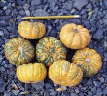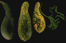 WMV2-winter squash leaves range from faint green to a severe yellow mottle. Leaves are malformed, puckered, and blistered. Veins sometimes extend beyond the normal leaf margin. Plants may become bushy with shortened internodes. Fruit can look healthy or can develop knobby overgrowths that distort its shape. Summer squash symptoms are similar, but internode lengths become extended, producing a leggy plant.