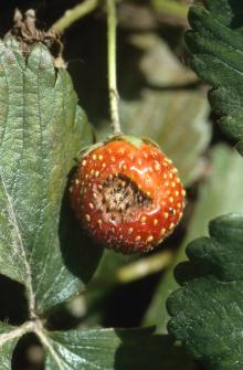 Fruit rot, also called black spot, is common in the PNW and starts as light-brown, water-soaked spots on ripening fruit. These spots rapidly develop into firm, round lesions that turn dark-brown to black. Lesions may be covered with pink to orange colored spores under humid conditions. The fruit remains firm and eventually dries up to a hard mummy. But in most cases the fruit is invaded by a whole host of other organisms and rots quickly. On green fruit, the fungus may only invade an individual achene, which turns black and slightly sunken. Flowers may also blight back before forming any fruit.