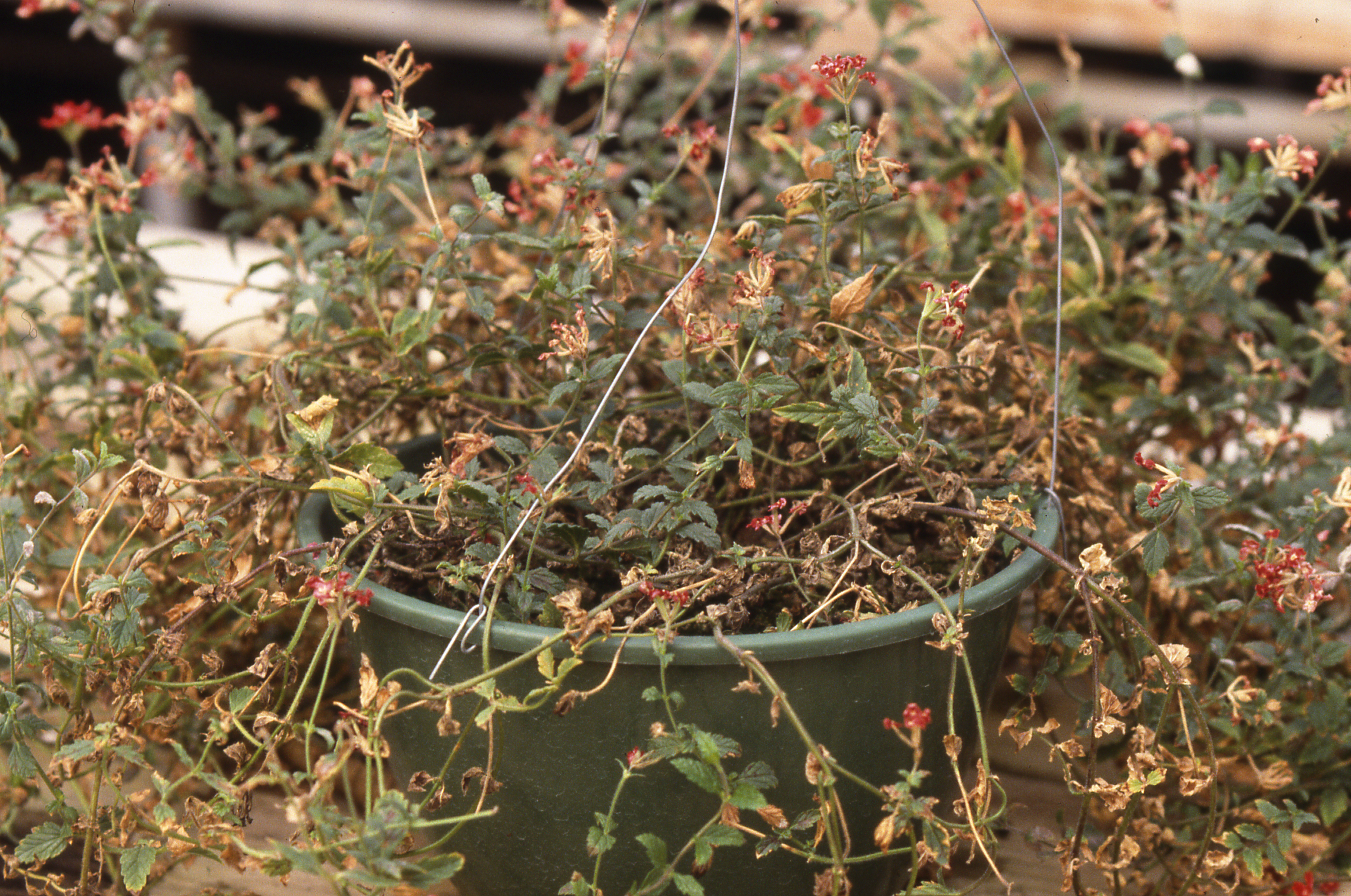 Symptoms Small, necrotic spots can develop on leaves, or leaves can be scorched. Plants generally look ratty and die back. Both tomato spotted wilt virus (TSWV) and impatiens necrotic spot virus (INSV) can infect verbena.