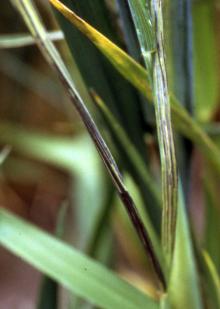 Symptoms Gray to grayish black streaks on leaves in the late tillering stage. Streaks break open later and release masses of gray-black spores. After this, infected leaves look quite frayed. If the infection is heavy, plants may be severely stunted, may tiller excessively, and usually fail to produce heads.