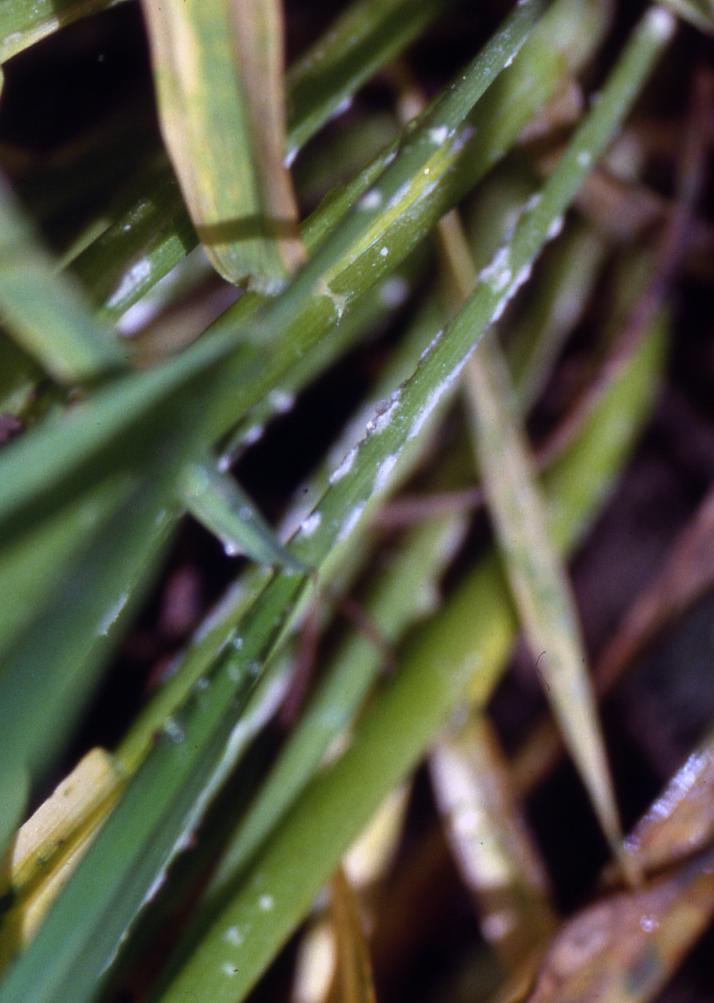 Cause The fungus, Blumeria graminis (syn. = Erysiphe graminis). Powdery mildew survives as either chasmothecia or as mycelium. Asexual (conidia) or sexual spores (ascospores formed in the chasmothecia) produced in the spring cause new infections on susceptible hosts. As colonies develop, more conidia are produced and disseminate. The powdery mildew colonies may eventually become spotted with tiny black dots, which are the chasmothecia. High humidity, temperatures ranging from 59°F to 72°F, and succulent growth favor mildew development. When the flag leaf becomes severely diseased by heading, yield losses can reach 50%.