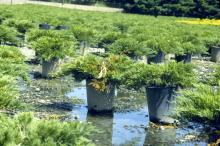 Water can be regulated easily where irrigation is used. Methods include longer times between irrigations, shorter irrigations, using the correct nozzle size or drip emitter, and preventing irrigation water from constantly contacting tree trunks. In Oregon nurseries, many of the same crops categorized as “low water users” also tend to be the ones with the most problems with Phytophthora diseases. These plants tend to be grown with other plants that require more water and therefore receive too much irrigation during the production cycle. Arranging plants according to water use may help alleviate some of the chronic problems nurseries have with these diseases.