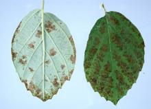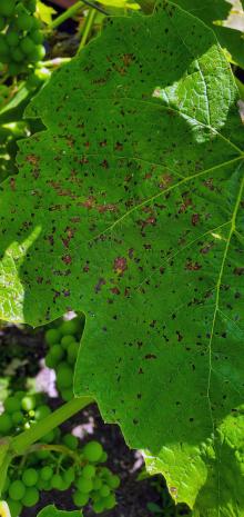 In grapes, it is referred to as “oxidant stipple” or “ozone stipple” and has been observed in Oregon. Symptoms of ozone damage appear predominantly on older grape leaves. Small interveinal spots (0.1mm to 0.5 mm in diameter), occur only on the upper leaf surface. The lower-leaf surface does not show stipple symptoms but may show necrotic spots if symptoms are severe. Stipple may begin as a yellow color but is most commonly recognized when spots become brownish-bronze-to-dark-brown. Heavily stippled leaves may have a uniform bronze appearance from a distance and necrotic spots up to 2mm in diameter. The tissue in the veins surrounding lesions remains green. Affected leaves eventually drop from the vine. Growers may confuse this with spray damage.