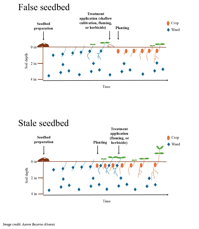 Several organic and non-organic herbicides are registered for use in vegetable crops as burndown products in stale and false seedbed systems. False seedbeds are prepared well in advance of vegetable seeding, and weed seedlings are encouraged to emerge before the crop is seeded. Fields with high weed population densities would benefit from more than one iteration of weed management before planting to reduce the weed populations. In high weed density fields, a late planting date may be more effective for weed control during the crop growing season, especially in organic production where herbicides can't be used after planting. Cultivation, herbicide application, or flaming are used to destroy the emerged seedlings. More recently, research at OSU is evaluating electric weeding as a new weed control tool in false seedbeds.