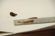 Pest description and damage The caterpillars are white to pinkish red with a dark head and are 1 to 3 inches in length when mature. They bore in the trunk and main branches of multiple host trees. Discolored or bleeding limbs, branch dieback, and lumpy or gnarled trunks may be indications of carpenterworm infestation. Look for sawdust-like material (frass) and wood chips mixed with loose webbing on or around the surface of infested trees. Trees or branches with severe carpenterworm infestations are susceptible to wind breakage and may need to be removed if they pose a safety hazard. The adult moths are 1.75 to 3.0 inches in length and mottled gray and black in color.
