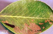 Pest description and damage Pear slug is a European insect now found in most areas of the U.S. It attacks both pear and cherry and is found on mountain ash, hawthorn, and ornamental Prunus. The adult is a glossy black fly-like insect, about 0.2 inch in length. The larva initially resembles a small tadpole due to the olive-green slime that covers the body, and the head being wider than the rest of the body. Mature larvae are 0.375 inch in length and orange yellow. Larvae feed on the upper surface of leaves, skeletonizing them. Heavy feeding causes leaf drop, with reduction in vigor and yield, particularly on young trees. California pear sawfly is found occasionally defoliating pear trees. Larvae eat and expand on round holes in leaves that can result in a leaf with only the midrib remaining. These bright green larvae match the host leaf color and rest along the edges of feeding area. While considered a minor pest on hawthorn and in orchards, these pests can potentially defoliate ornamental pears.