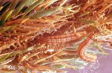 Pest description and damage The adult juniper webworm is a copper-brown moth with white bands on the edges of the front wings. The moth is about 0.5 inch across. The mature larva is a yellowish to brownish caterpillar, 0.05 to 0.06 inch in length, with dark brown lines on the back and a dark head. The webworm caterpillars initially feed by mining inside leaves, then gather to feed in small colonies or nests of webbed foliage as they mature. Due to their habit of feeding deep in the plant canopy, damage is overlooked. Damaged foliage turns brown and is covered with dirty webbing. Considerable amounts of foliage are spun together, and small trees may be completely webbed. Frequently, damage is observed in early spring from March to May. This pest infests only junipers.