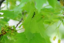 Description, damage, biology and life history These 0.1-inch-long aphids on maple are most severe in the spring. This aphid usually develops wings and flies from the host in spring about the time it is reaching noticeable numbers. The aphids return in fall, congregating at the base of the tree. Honeydew production is usually the most noticeable problem with these aphids. When numbers of aphids are high, look for small gnat-like insects patrolling the leaves. These are parasitoid wasps seeking aphid hosts.