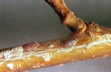 Pest description and damage Scale insects are small (less than 0.125 inch in length) soft insects that live beneath waxy scales. These insects are often identified by the shape and size of their scales, the description of adult males and females, immature crawler stage, color of eggs, and host plant preferences. Mature cottony maple scale insects are relatively large, flat, oval, brown scales 0.25 to 0.375 inch in diameter. The "cotton" is waxy threads covering as many as 1,500 eggs. The developing females and nymphs produce copious amounts of honeydew that can collect on foliage and branches and cause growth of sooty mold. Honeydew is also a nuisance when it falls on nearby cars and sidewalks, and it attracts bees, wasps, and ants. Occasionally, heavy outbreaks of this scale occur, usually on weakened or stressed trees. Cottony maple scale reaches epidemic numbers on silver maple, but noticeable populations can occur on red maple. It survives on other species of maple, honey and black locust, white ash, euonymus, oak, boxelder, dogwood, hackberry, sycamore, beech, elm, willow, basswood, and poplar.