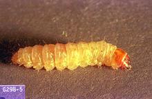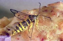 Pest description and damage The adult is a clearwing moth about 1.0 to 1.25 inches in length with yellow and black markings resembling yellowjacket wasps. The larvae are about 1 inch long, yellowish, with a reddish-brown head. Larvae feed by boring into branches or trunks. At the point where the larva enters the wood, small to large masses of creamy yellow to pinkish pitch accumulate. The larva feeds locally underneath the pitch mass. This pest causes mainly aesthetic damage because of the pitch masses. They do not attack sequoia (aka the coast redwood).