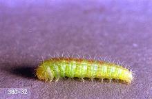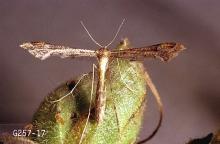 Pest description and damage Adult is a grayish to tan T-shaped moth with slender, plumed wings and a 0.5-inch wingspan. The small greenish larvae are about 0.5 inch long when mature. The larvae initially mine within leaves. Later, they feed on terminal leaves and bore into developing flowers and inside the stems.