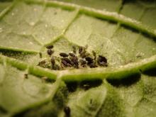 Pest description and crop damage The green peach aphid is slender, dark green to yellow, and has no waxy bloom. Infestations may result in wilting. The melon aphid is variable in color but is often light green mottled with dark green. Unlike other aphids, it is able to tolerate hot weather. The potato aphid has both a pink and green form. It is a larger aphid. High potato aphid populations can distort leaves and stems, stunt plants, and cause necrotic spots on leaves. These aphids also secrete a large amount of honeydew that promotes development of sooty mold on foliage and fruit.