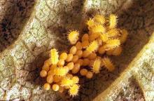 Following feeding, adult females deposit eggs in clusters of 40 or more on the undersurface of leaves. Eggs hatch in 5 to 14 days, and larvae continue to feed for 2 to 5 weeks. Larvae pupate on leaves, and adults emerge after about 10 days. Adults feed, mate, and lay eggs over a period of two weeks. Generation time from egg to adult is about 30 days. There may be up to four generations each year.
